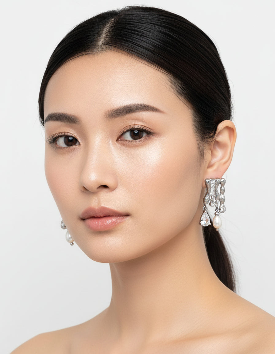 美しい輝きを放つジルコニアと、動きのある3連メタルデザイン、上品な淡水パールが耳元を華やかに見せるアイテム。