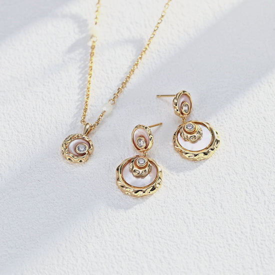 美しく艶めくマザーオブパール風モチーフと、輝きの強いジルコニアが耳元に洗練された印象をもたらすアイテム。