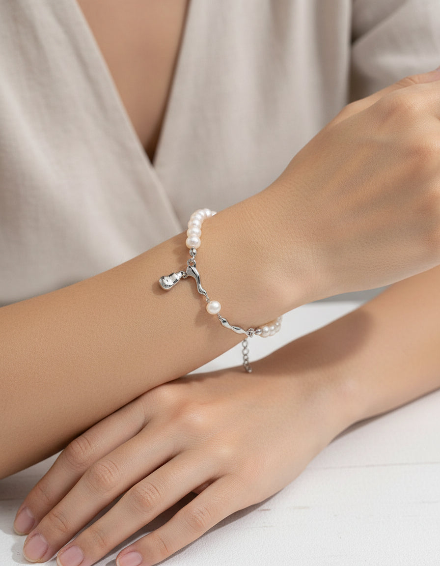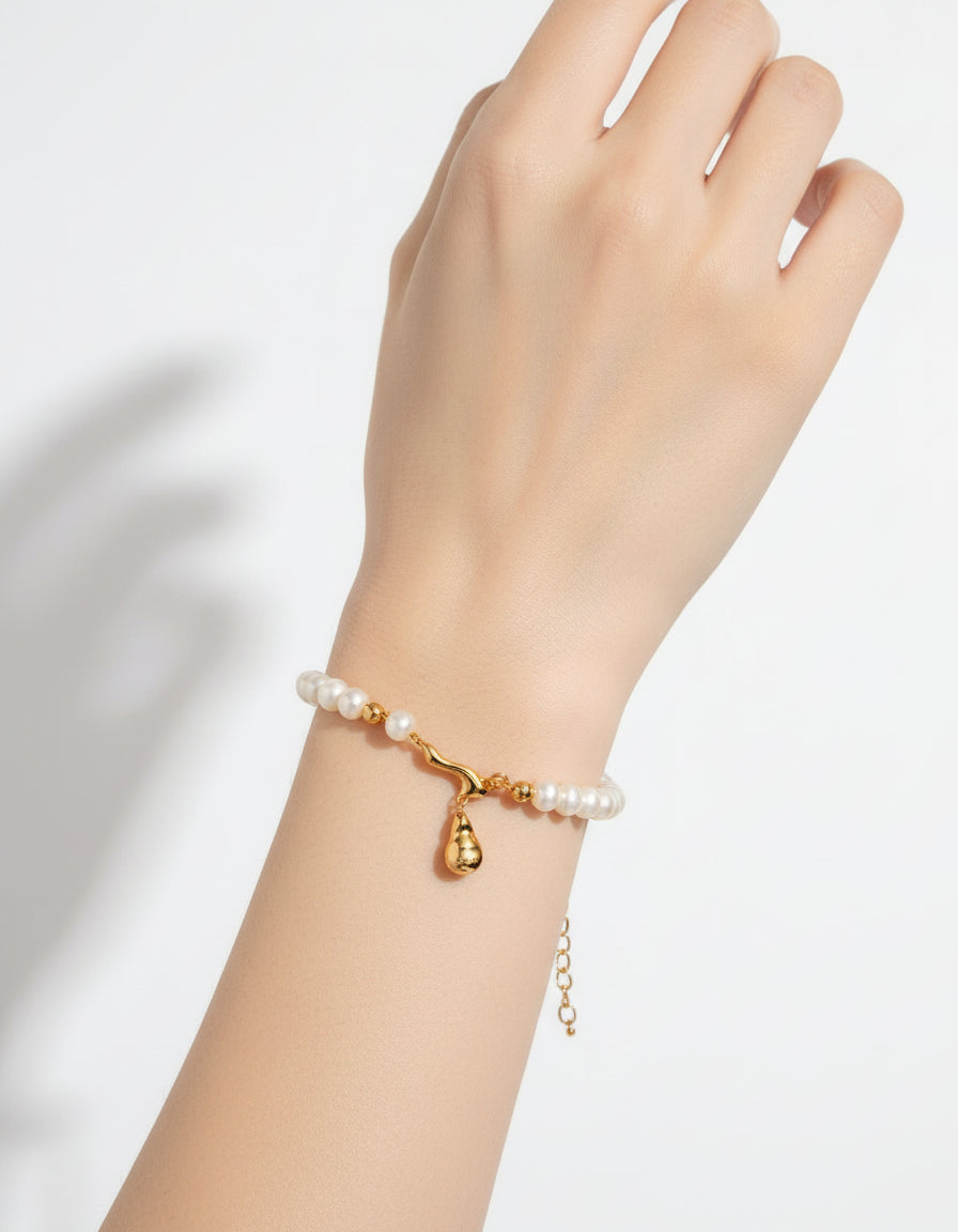 柔らかな光を放つ淡水パールに、有機的なラインが美しいゴールドパーツを組み合わせた上品ブレスレット。