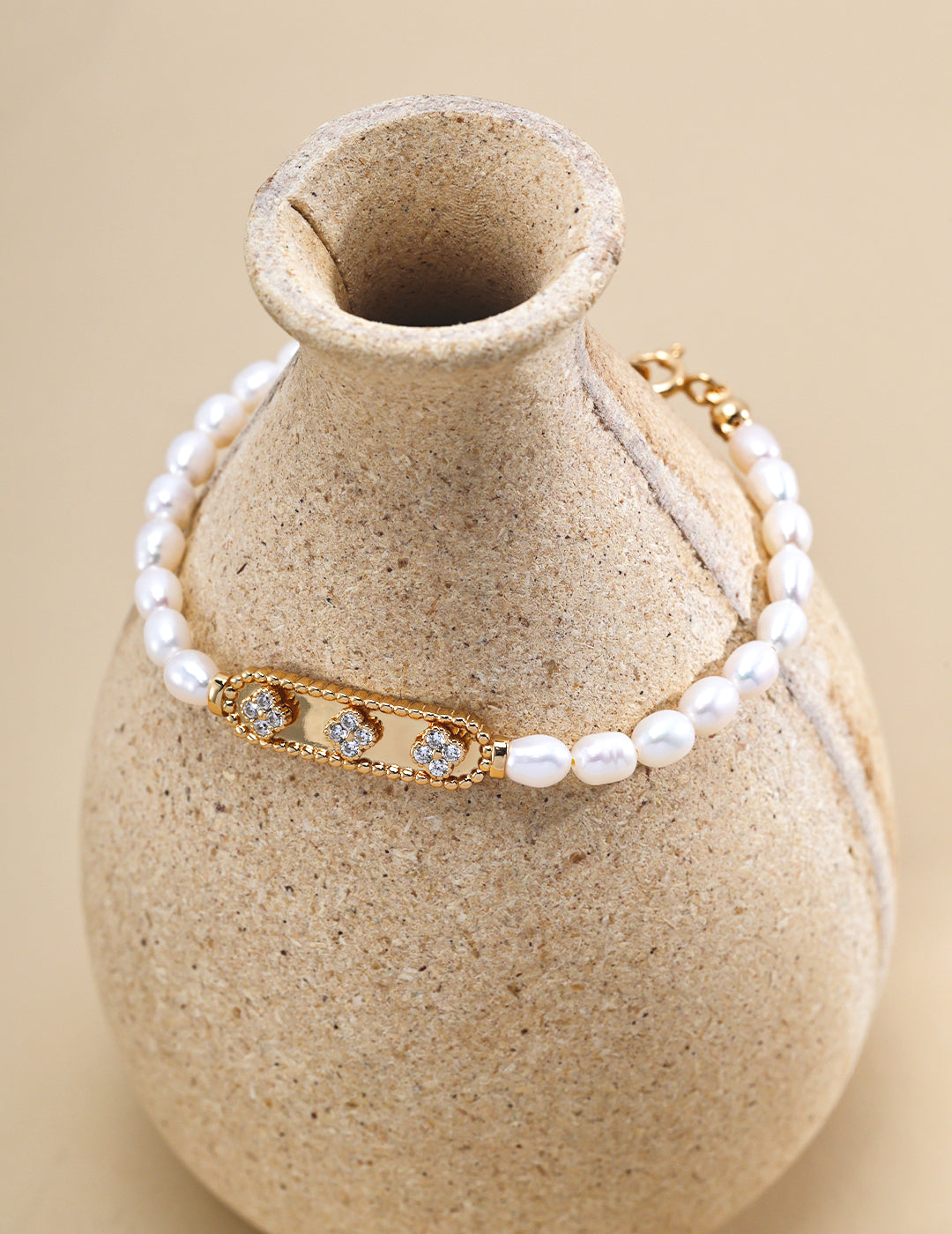 淡水パールの柔らかな光に、メタリックカラーのバーを添えた上品なブレスレット。