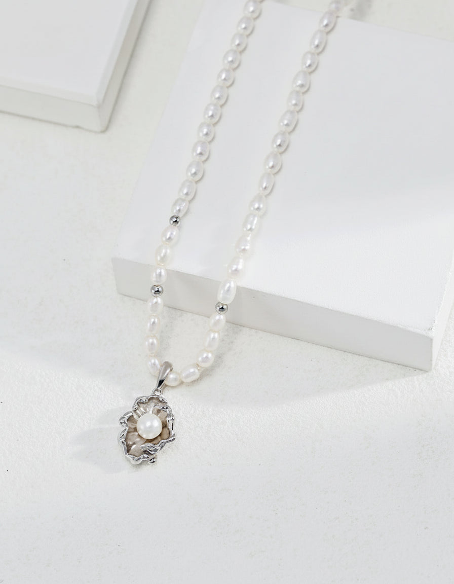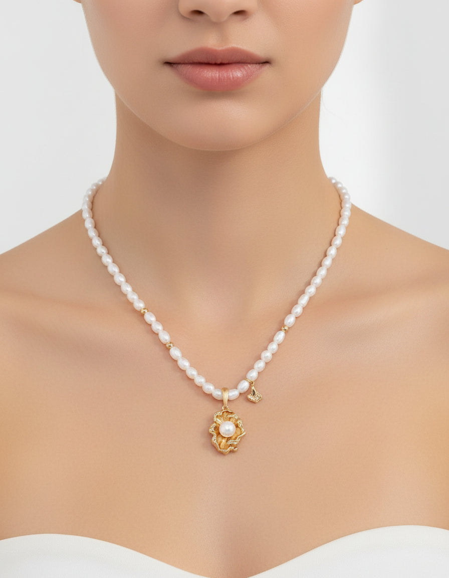 瑞々しい光沢を放つ淡水パールと、溶岩風の立体フレームが首元を華やかに見せるデザインネックレス。