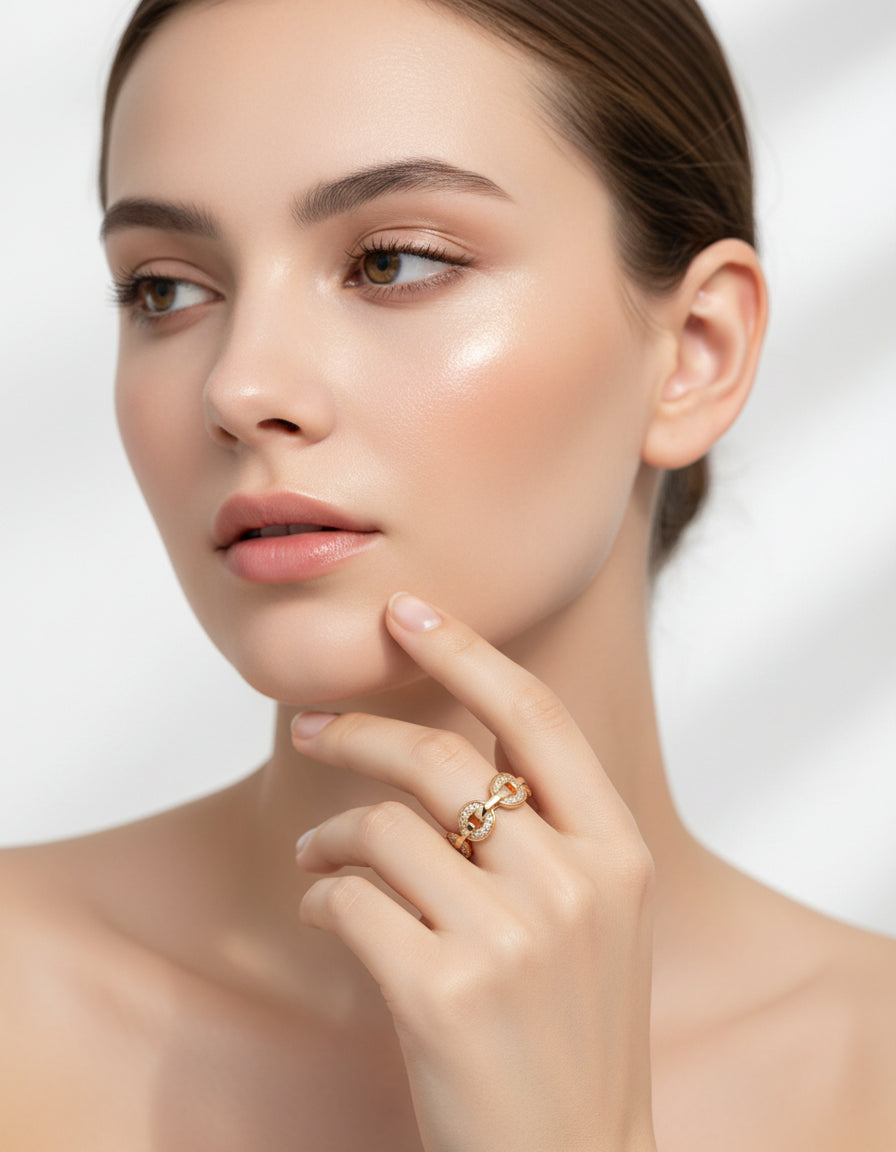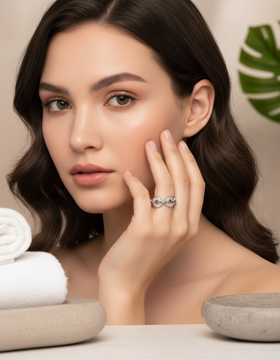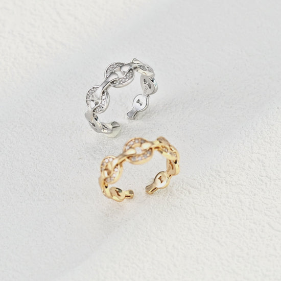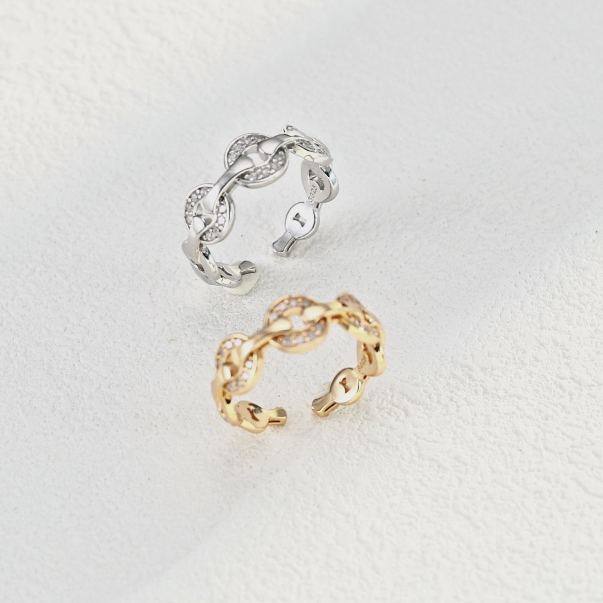 細やかな輝きを放つジルコニアと、存在感のあるチェーンモチーフが手元を華やかに見せるS925リング。